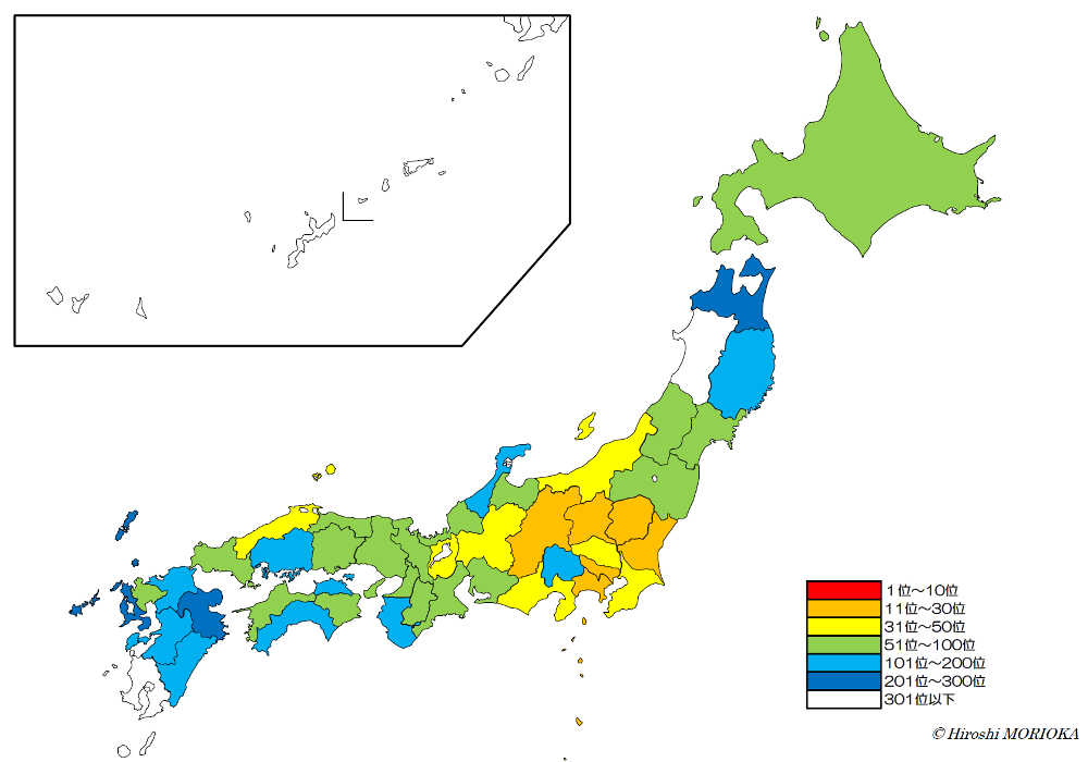 青木さんの都道府県別の順位を日本地図で色分けしたものです。