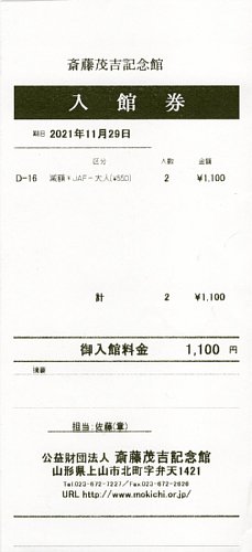| 【斎藤茂吉記念館】(上山市) ほぼレシートの半券 |